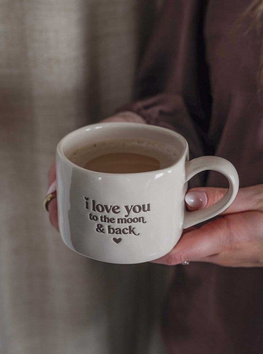 Ihana muki, jossa on orgaanisen käsintehdyn tuntu ja silkkipainoteksti keramiikassa.